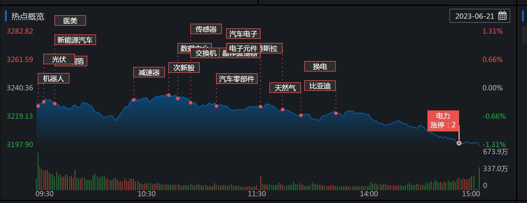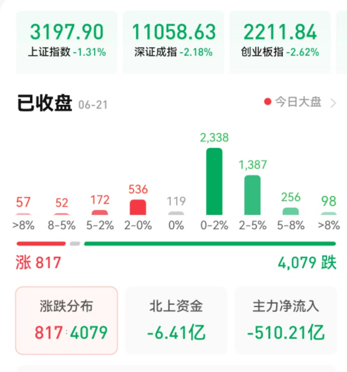 周三(6月21日),A股三大股指震蕩回落,全線飄綠。截至收盤,上證指數(shù)跌1.31%,報(bào)3197.9點(diǎn);深證成指跌2.18%,報(bào)11058.63點(diǎn);創(chuàng)業(yè)板指跌2.62%,報(bào)2211.84點(diǎn)。兩市合計(jì)成交金額10219億元,連續(xù)第6個(gè)交易日突破萬億元。北向資金凈賣出6.41億元??傮w上看,兩市個(gè)股跌多漲少,超4000只個(gè)股下跌,其中,漲停個(gè)股達(dá)47只,跌停個(gè)股達(dá)20只。