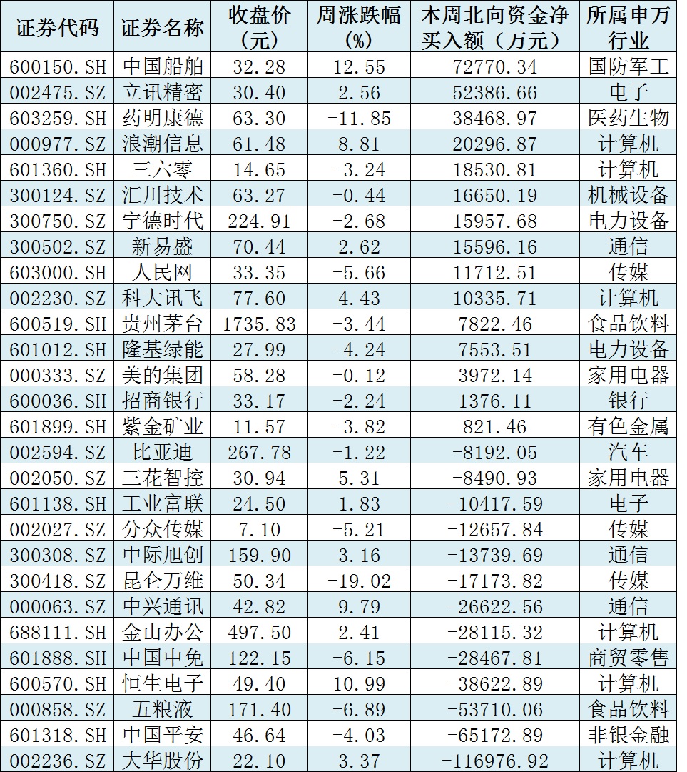 資金方面,本周北向資金累計(jì)凈賣出金額達(dá)3.46億元。從前十大成交活躍股來看,本周,中國船舶、立訊精密等兩只個股,北向資金凈買入金額均超5億元。另外,大華股份、中國平安、五糧液等個股遭北向資金凈賣出金額均超5億元。