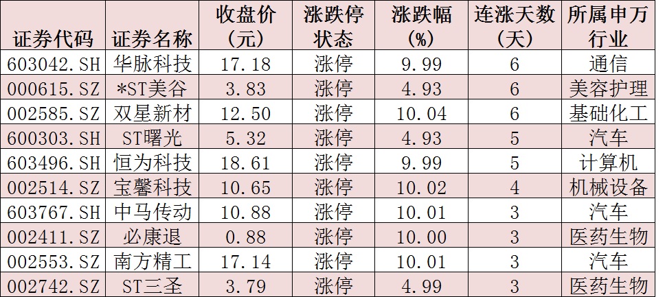 表:連續(xù)上漲3日且今日收盤漲停個(gè)股情況: