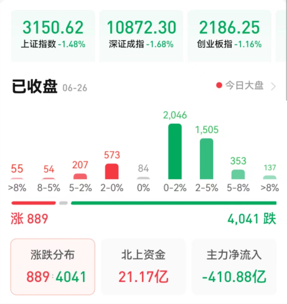 周一(6月26日),A股三大指數(shù)震蕩下行,全線下跌。截至收盤,上證指數(shù)跌1.48%報(bào)3150.62點(diǎn),深證成指跌1.68%報(bào)10872.3點(diǎn),創(chuàng)業(yè)板指跌1.16%報(bào)2186.25點(diǎn);兩市合計(jì)成交額達(dá)9773億元,北向資金凈買入21.17億元??傮w上看,兩市個(gè)股跌多漲少,下跌個(gè)股超4000只,其中,漲停個(gè)股達(dá)46只,跌停個(gè)股達(dá)31只。