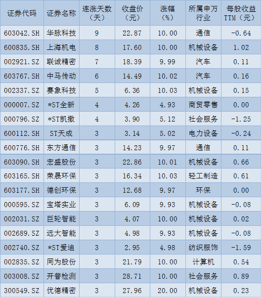 表:連續(xù)上漲3日且今日收盤漲停股一覽
