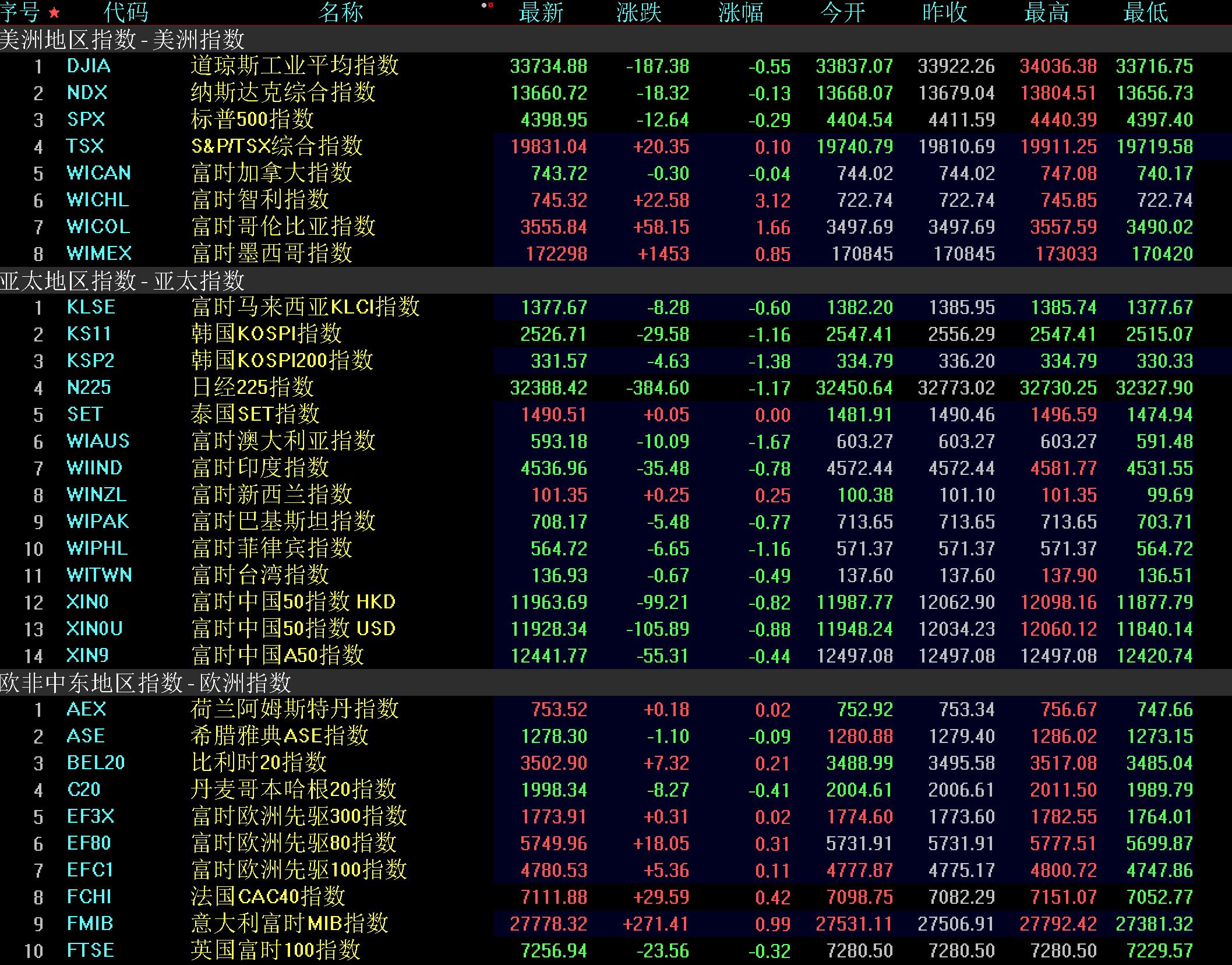 周五,美國三大股指全線收跌,道指跌0.55%報33734.88點(diǎn),標(biāo)普500指數(shù)跌0.29%報4398.95點(diǎn),納指跌0.13%報13660.72點(diǎn)。本周,道指跌1.96%,標(biāo)普500指數(shù)跌1.16%,納指跌0.92%。