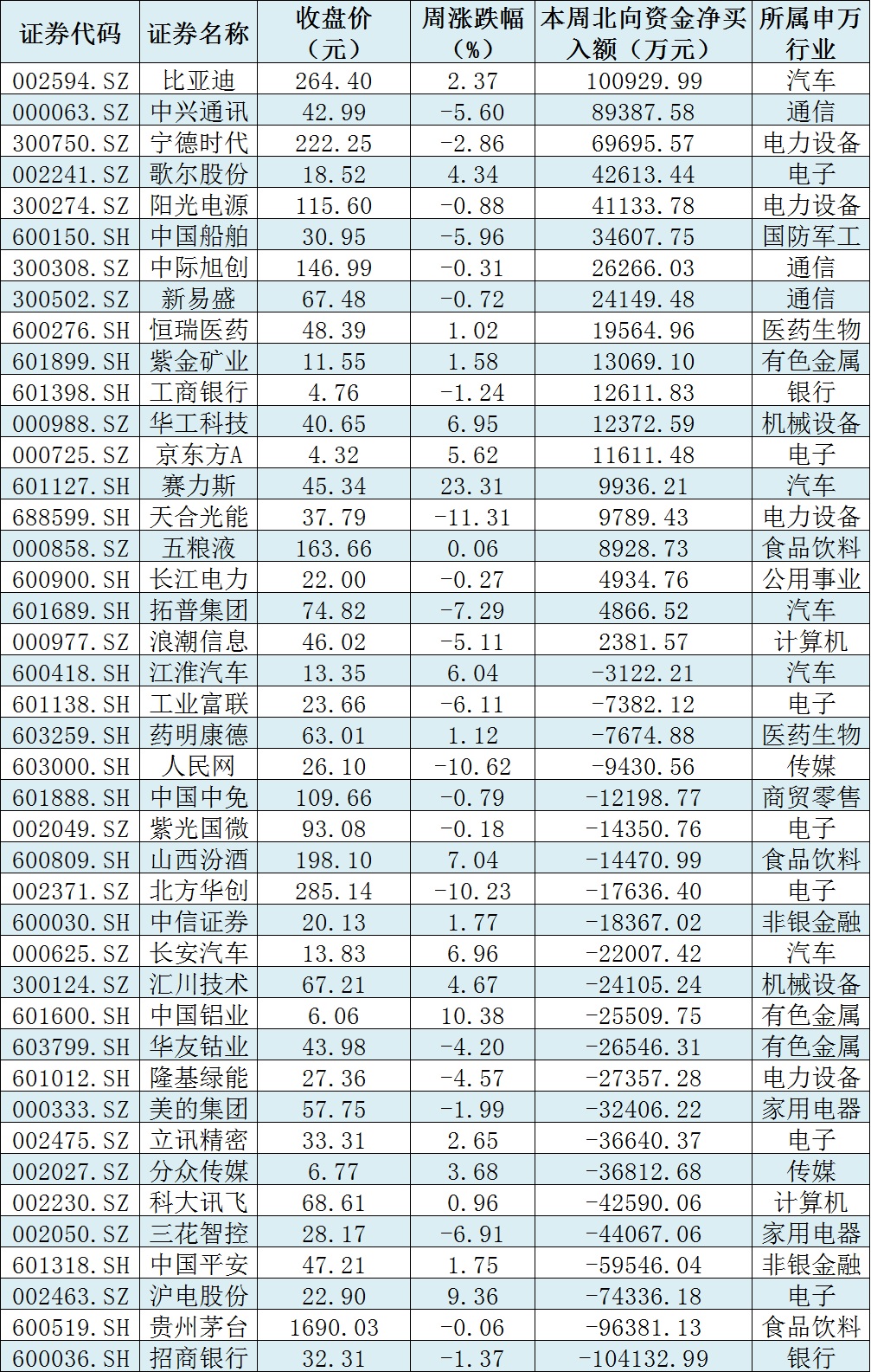 資金方面,本周北向資金累計凈賣出金額達(dá)91.6億元。從前十大成交活躍股來看,本周,比亞迪、中興通訊、寧德時代等3只個股,北向資金凈買入金額均超6億元。另外,招商銀行、貴州茅臺、滬電股份等個股遭北向資金凈賣出金額均超7億元。