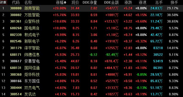 具體看,截至7月17日上午收盤(pán),虛擬電廠板塊強(qiáng)勁拉升,漲幅居首達(dá)2.51%,資金凈流入達(dá)57.76億元。其中,迦南智能20cm漲停,萬(wàn)勝智能、眾智科技、國(guó)電南自等概念股漲幅均超10%。