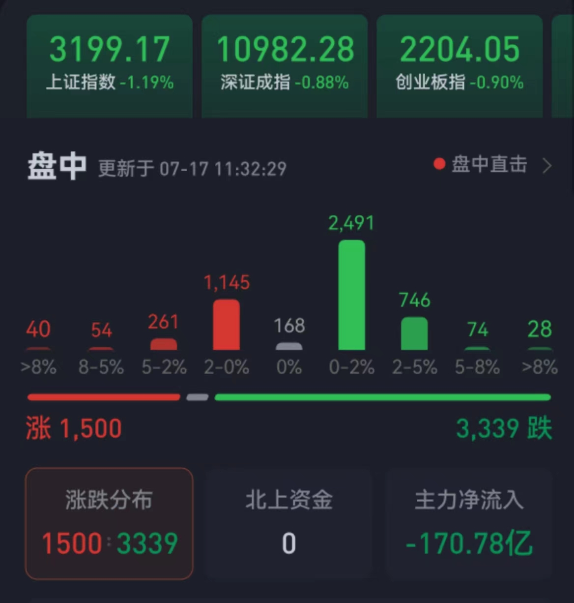 周一(7月17日),三大股指震蕩整理,有所回落。截至上午收盤(pán),上證指數(shù)跌1.19%,報(bào)3199.17點(diǎn),失守3200點(diǎn)整數(shù)關(guān)口;深證成指和創(chuàng)業(yè)板指分別跌0.88%和0.90%;滬深兩市合計(jì)成交額5271.0億元,總體來(lái)看,兩市個(gè)股跌多漲少,超3000只個(gè)股下跌。其中,有24只個(gè)股漲停,9只個(gè)股跌停。