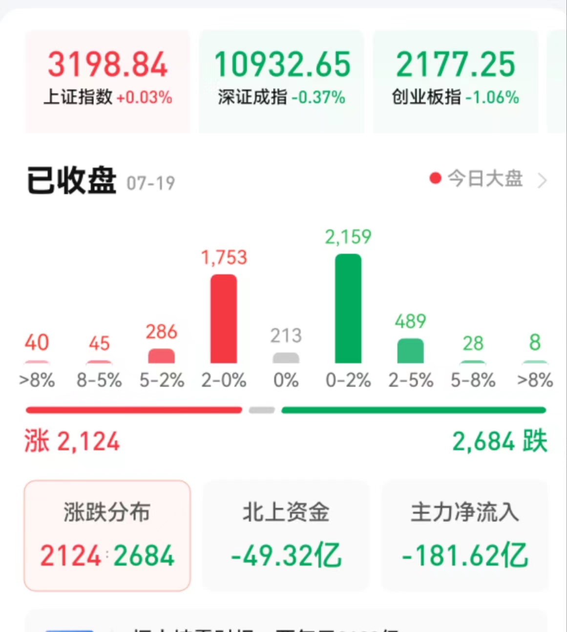 周三(7月19日),A股三大股指震蕩分化,漲跌不一。截至收盤,上證指數(shù)微漲0.03%報(bào)3198.84點(diǎn),深證成指跌0.37%報(bào)10932.65點(diǎn),創(chuàng)業(yè)板指跌1.06%報(bào)2177.25點(diǎn),上證50指數(shù)漲0.22%;兩市合計(jì)成交7024.54億元,北向資金凈賣出49.32億元??傮w上看,兩市個(gè)股跌多漲少。其中,漲停個(gè)股22只,跌停個(gè)股2只。