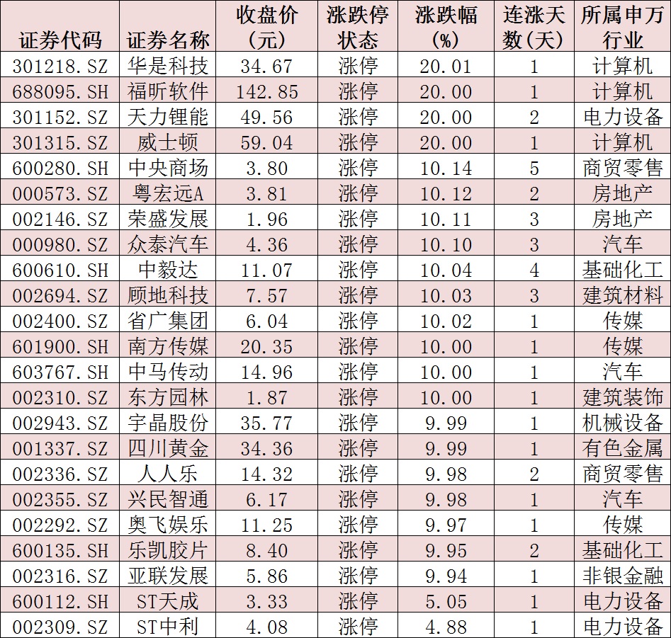 具體來看,今日,貴金屬板塊領(lǐng)漲,四川黃金漲停;空間計(jì)算概念股盤中拉升,華是科技漲停;房地產(chǎn)板塊午后走強(qiáng),粵宏遠(yuǎn)A、榮盛發(fā)展?jié)q停;零售板塊持續(xù)活躍,中央商場4連板,人人樂漲停;傳媒板塊盤中異動(dòng),南方傳媒等3只個(gè)股漲停;ERP概念、空間計(jì)算、黃金概念、汽車拆解概念、房地產(chǎn)服務(wù)等板塊表現(xiàn)活躍。金屬新材料板塊領(lǐng)跌,胎壓監(jiān)測、3D打印、高壓快充、自動(dòng)化設(shè)備、國防軍工、OLED、存儲芯片等板塊跌幅居前。