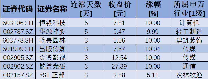表:連續(xù)上漲3日且今日收盤(pán)漲停股一覽