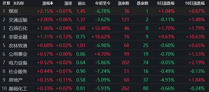 從31個(gè)申萬(wàn)一級(jí)行業(yè)看,8月10日共有20個(gè)行業(yè)上漲,煤炭漲幅居首,達(dá)2.15%,交通運(yùn)輸緊隨其后,漲2%;石油石化全天強(qiáng)勢(shì),漲1.86%;非銀金融午后拉升,漲1.31%。下跌方面,家用電器跌0.90%居首,汽車、食品飲料、建筑材料、建筑裝飾跌幅居前。