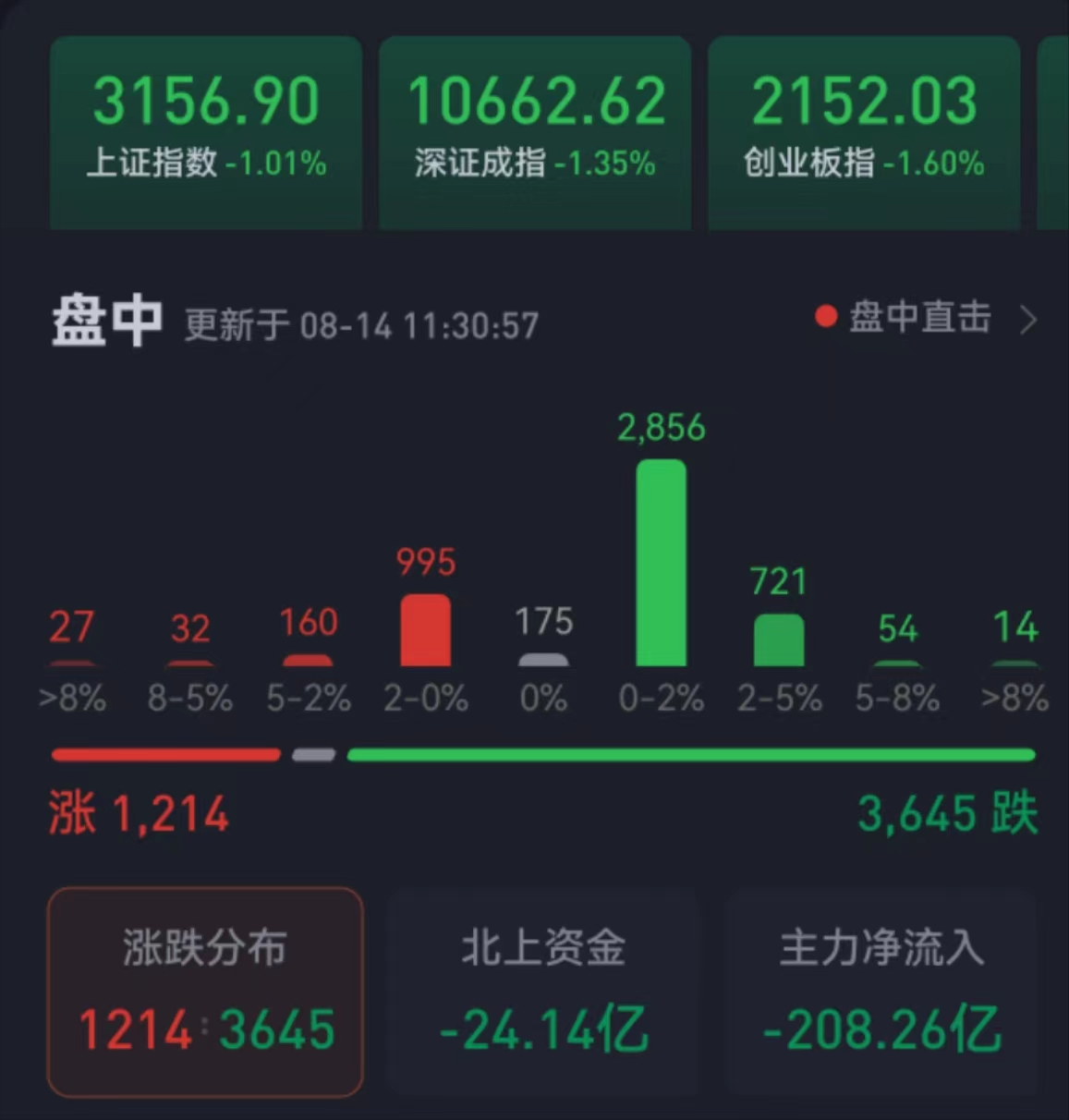 周一(8月14日),三大股指繼續(xù)震蕩回落,跌幅均超1%。截至上午收盤(pán),上證指數(shù)跌幅達(dá)1.01%,報(bào)3156.90點(diǎn);深證成指和創(chuàng)業(yè)板指跌幅分別為1.35%和1.60%;滬深兩市合計(jì)成交額4603.5億元,總體來(lái)看,兩市個(gè)股跌多漲少,超3600只個(gè)股下跌。