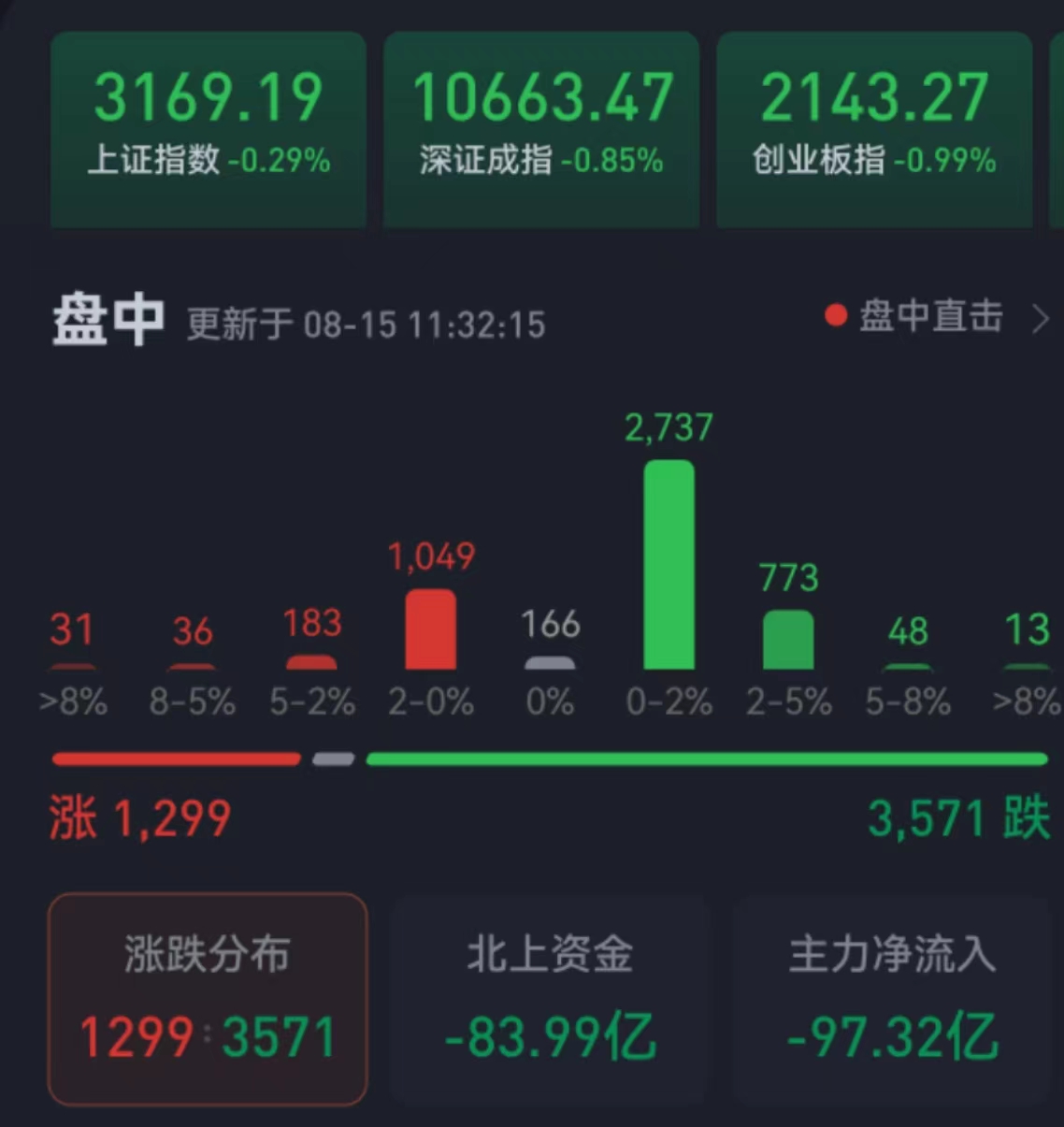 周二(8月15日),三大股指繼續(xù)震蕩整理。截至上午收盤,上證指數(shù)跌幅達(dá)0.29%,報(bào)3169.19點(diǎn);深證成指和創(chuàng)業(yè)板指跌幅分別為0.85%和0.99%;滬深兩市合計(jì)成交額4276.9億元,總體來看,兩市個(gè)股跌多漲少,下跌個(gè)股近3600只。