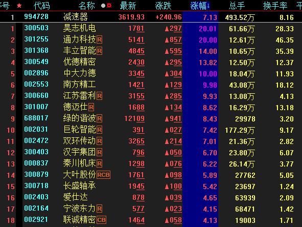 具體看,截至8月17日上午收盤,減速器板塊漲幅居首,達(dá)7.13%。其中,昊志機(jī)電、通力科技等概念股20CM漲停。