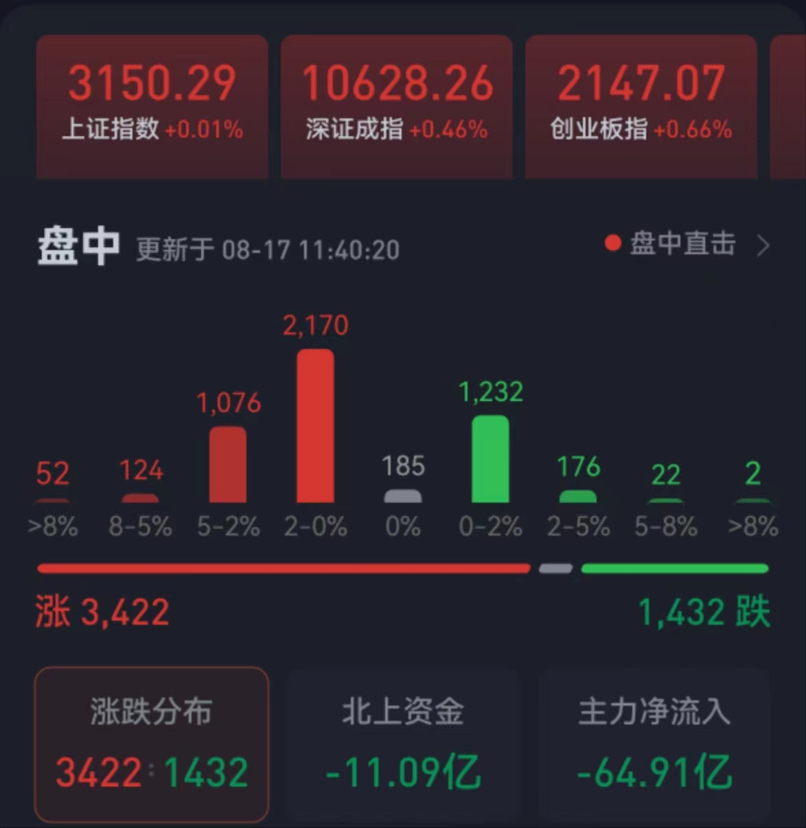 周四(8月17日),三大股指震蕩攀升,頑強(qiáng)翻紅。截至上午收盤,上證指數(shù)漲幅達(dá)0.01%,報(bào)3150.29點(diǎn);深證成指和創(chuàng)業(yè)板指漲幅分別為0.46%和0.66%;滬深兩市合計(jì)成交額4711.4億元,總體來(lái)看,兩市個(gè)股漲多跌少,其中,超3400只個(gè)股上漲。