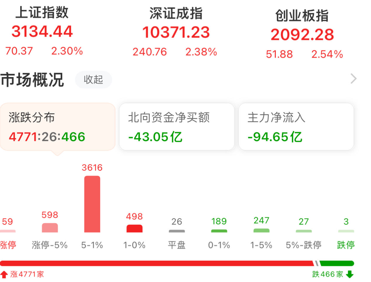 周一(8月28日),三大股指集體大漲。截至上午收盤,上證指數(shù)漲2.3%,報(bào)3134.44點(diǎn);深證成指和創(chuàng)業(yè)板指分別漲2.38%和2.54%;滬深兩市合計(jì)成交額7776.23億元,總體來看,兩市個(gè)股漲多跌少,4771只個(gè)股上漲,466只個(gè)股下跌。其中,59只個(gè)股漲停,3只個(gè)股跌停。