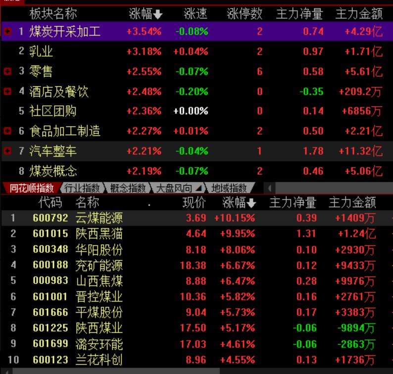 具體看,截至9月1日上午收盤,煤炭開采加工板塊表現(xiàn)搶眼,漲幅達3.54%。其中,云煤能源和陜西黑貓強勢漲停。
