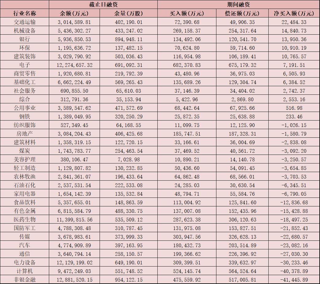 表:8月31日申萬一級行業(yè)兩融交易情況