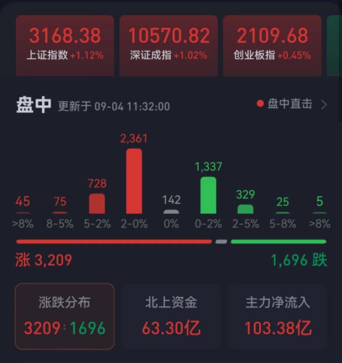 周一(9月4日),三大股指高開高走。截至上午收盤,上證指數(shù)漲幅達(dá)1.12%,報(bào)3168.38點(diǎn);深證成指和創(chuàng)業(yè)板指漲幅分別為1.02%和0.45%;滬深兩市合計(jì)成交額5495.1億元,總體來看,兩市個(gè)股漲多跌少,超3200只個(gè)股上漲,其中,41只個(gè)股漲停,僅有1只個(gè)股跌停。