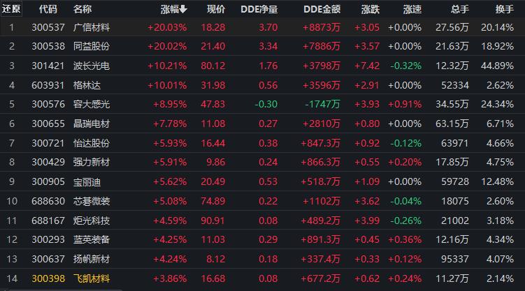 具體看,截至9月5日上午收盤(pán),光刻膠板塊漲幅居首,達(dá)3.22%。其中,廣信材料、同益股份等概念股均20CM漲停。