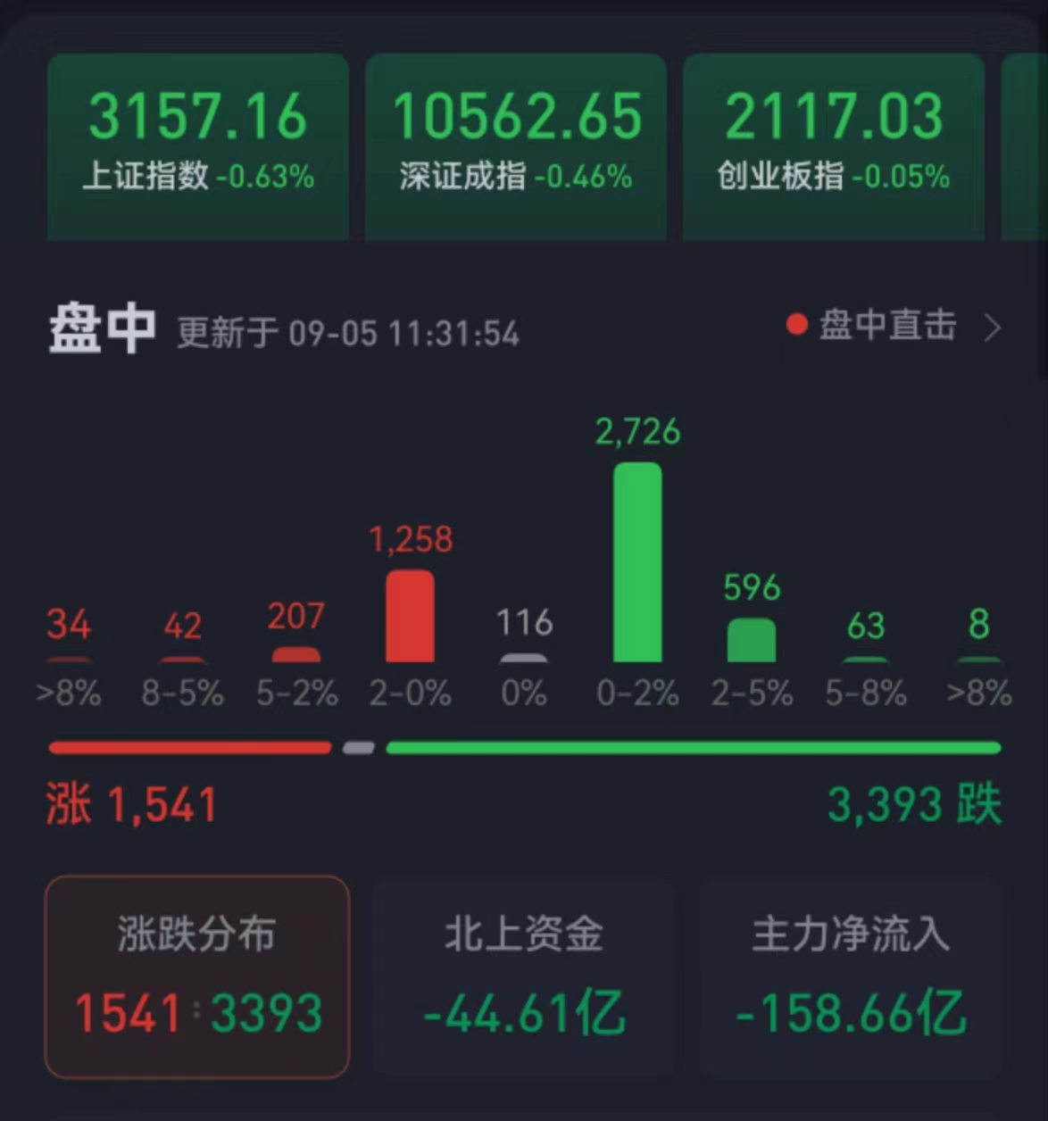 周二(9月5日),三大股指震蕩回落。截至上午收盤(pán),上證指數(shù)跌幅達(dá)0.63%,報(bào)3157.16點(diǎn);深證成指和創(chuàng)業(yè)板指跌幅分別為0.46%和0.05%;滬深兩市合計(jì)成交額5235.7億元,總體來(lái)看,兩市個(gè)股跌多漲少,近3400只個(gè)股下跌。