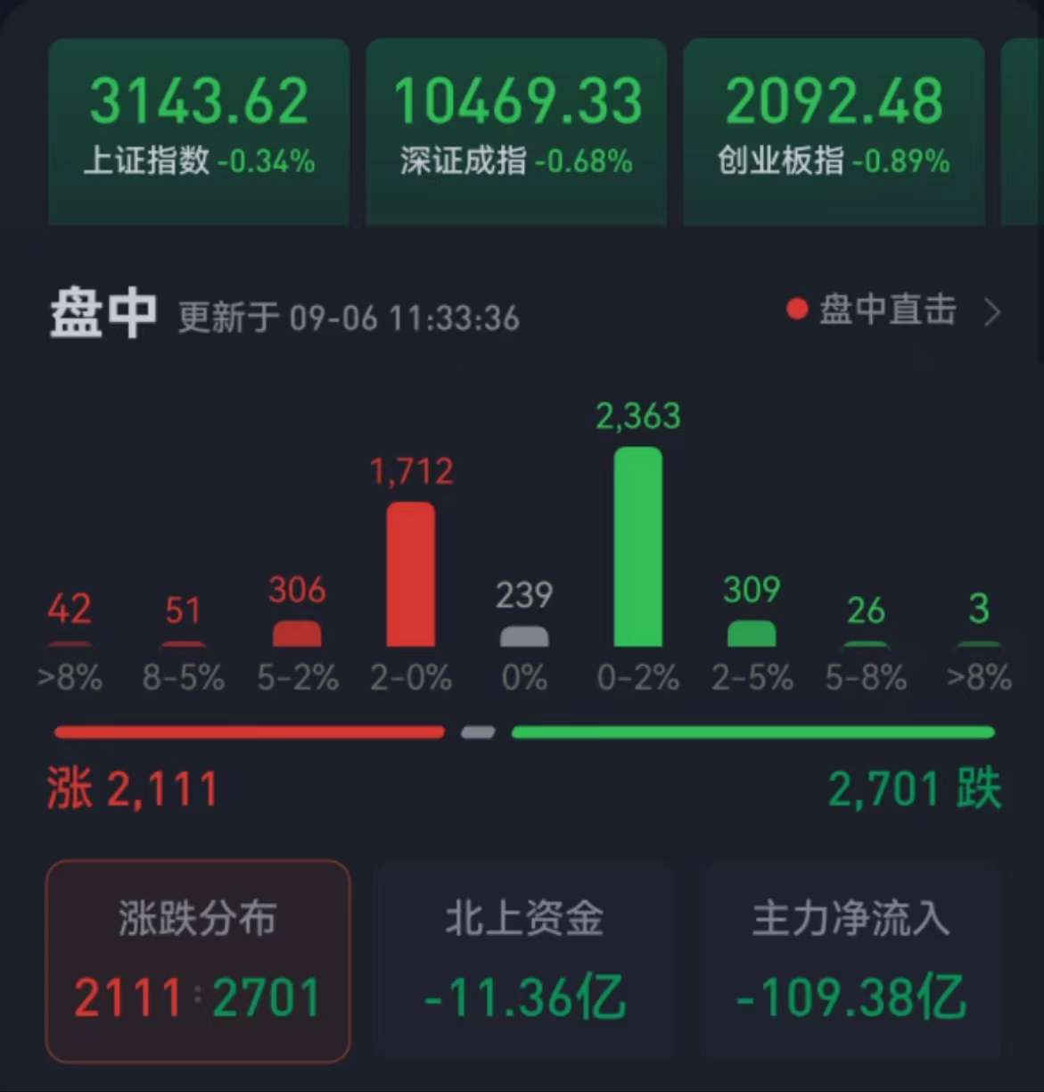 周三(9月6日),三大股指繼續(xù)震蕩整理。截至上午收盤,上證指數(shù)跌幅達(dá)0.34%,報(bào)3143.62點(diǎn);深證成指和創(chuàng)業(yè)板指跌幅分別為0.68%和0.89%;滬深兩市合計(jì)成交額4356.6億元,總體來(lái)看,兩市個(gè)股跌多漲少。其中,29只個(gè)股漲停,1只個(gè)股跌停。
