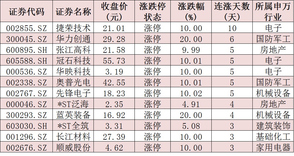 連續(xù)上漲3日且今日收盤漲停個(gè)股情況
