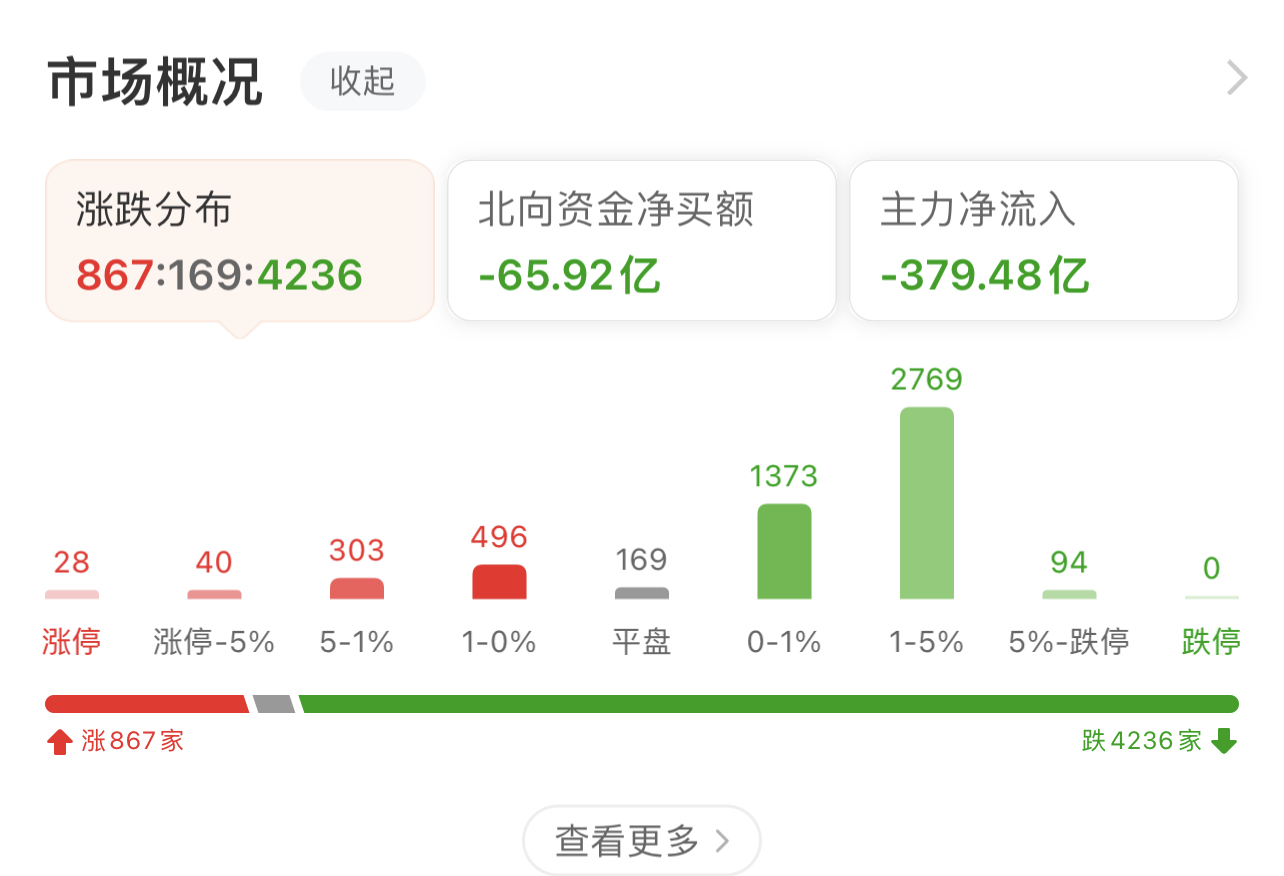 周三(9月13日),截至收盤,A股三大指數(shù)集體收跌,創(chuàng)業(yè)板指盤中創(chuàng)年內(nèi)新低,最低到2015.39點(diǎn),具體來看,上證指數(shù)跌0.45%,報3123.07點(diǎn),深證成指跌1.14%,報10255.87點(diǎn),創(chuàng)業(yè)板指跌1.14%,報2027.73點(diǎn);滬深兩市合計成交額6981.89億元;北向資金凈賣出65.92億元;總體來看,A股個股跌多漲少,上漲個股為867只,下跌個股4236只。