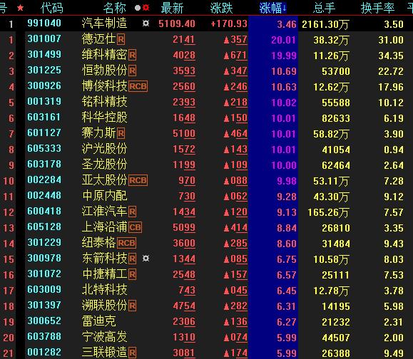 具體看,截至9月18日上午收盤(pán),汽車(chē)制造板塊強(qiáng)勁上揚(yáng),漲幅居首達(dá)3.46%,多只概念股集體漲停,上演“漲停潮”。其中,德邁仕和維科精密“20cm”漲停,恒勃股份和博俊科技等概念股漲幅均超10%。銘科精技、科華控股、賽力斯、滬光股份、圣龍股份、亞太股份等概念股紛紛漲停。