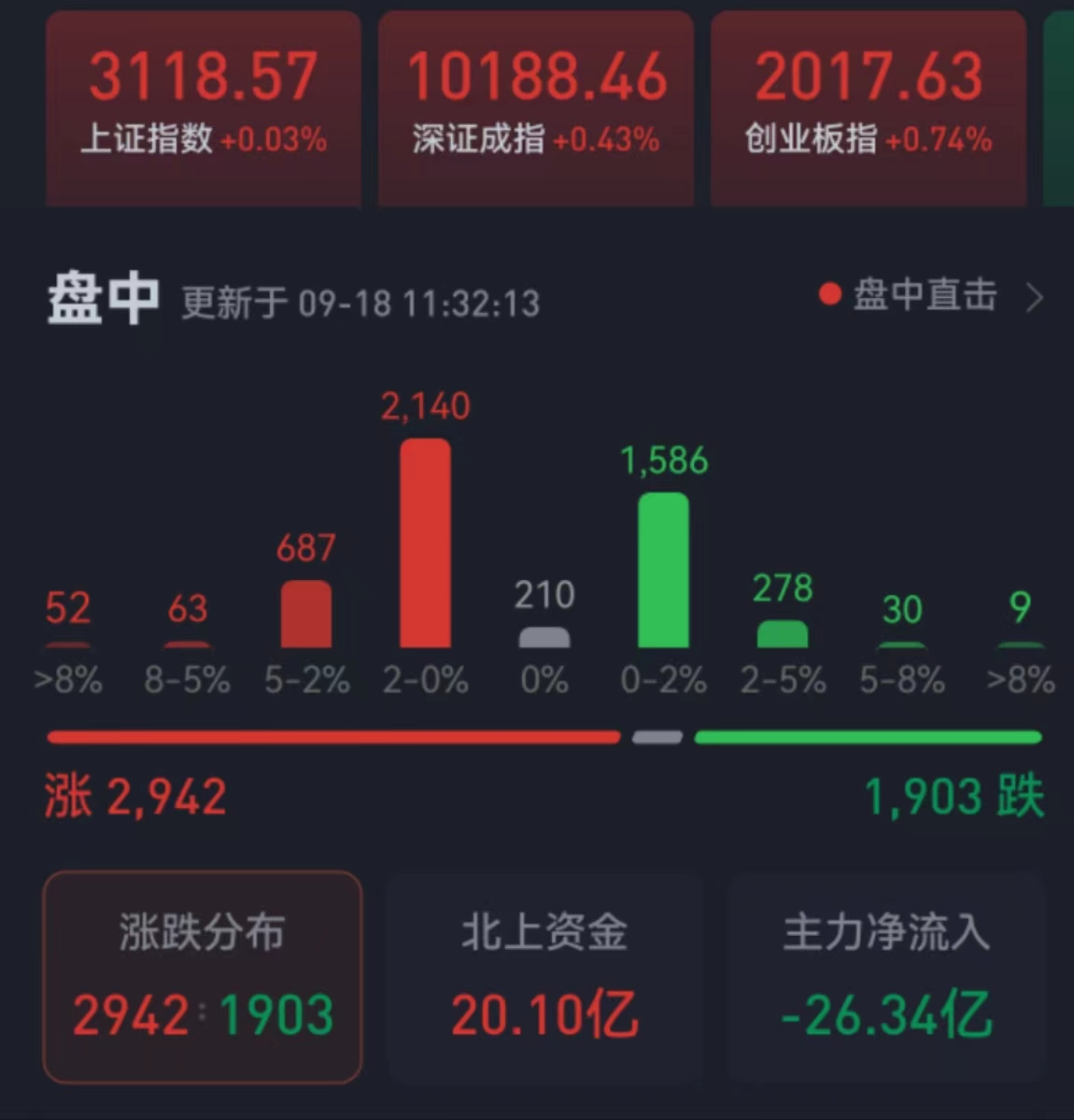 周一(9月18日),三大股指震蕩攀升,全線飄紅。截至上午收盤(pán),上證指數(shù)漲幅達(dá)0.03%,報(bào)3118.57點(diǎn);深證成指和創(chuàng)業(yè)板指漲幅分別為0.43%和0.74%;滬深兩市合計(jì)成交額4455.1億元,總體來(lái)看,兩市個(gè)股漲多跌少,上漲個(gè)股近3000只。漲停個(gè)股達(dá)46只,跌停個(gè)股達(dá)7只。