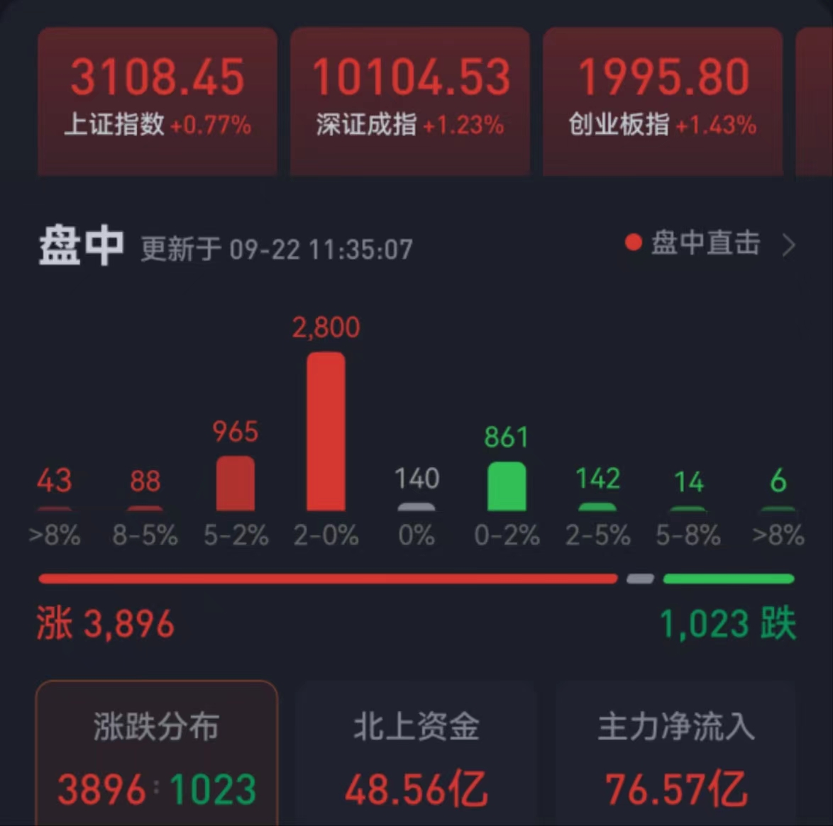 周五(9月22日),三大股指震蕩反彈,全線飄紅。截至上午收盤,上證指數(shù)漲幅達(dá)0.77%,報(bào)3108.45點(diǎn);深證成指和創(chuàng)業(yè)板指漲幅分別為1.23%和1.43%;滬深兩市合計(jì)成交額4452.1億元,總體來(lái)看,兩市個(gè)股漲多跌少,近3900只個(gè)股實(shí)現(xiàn)上漲。漲停個(gè)股達(dá)20只,跌停個(gè)股達(dá)5只。