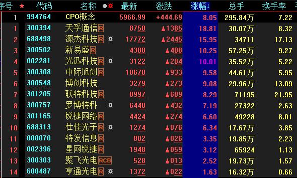 具體看,截至9月22日上午收盤,CPO概念板塊漲幅居首,達(dá)8.05%。其中,天孚通信、源杰科技、新易盛等概念股漲幅均超10%,光迅科技漲停。
