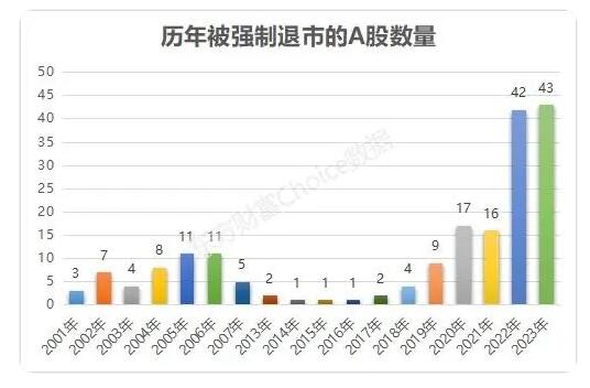 2023年行將結(jié)束,從退市公司數(shù)量來看,今年又是一個“大年”。東方財富Choice數(shù)據(jù)顯示,截至12月19日收盤,年內(nèi)已有43只A股被強制退市,超過2022年的42只,再創(chuàng)歷史新高。