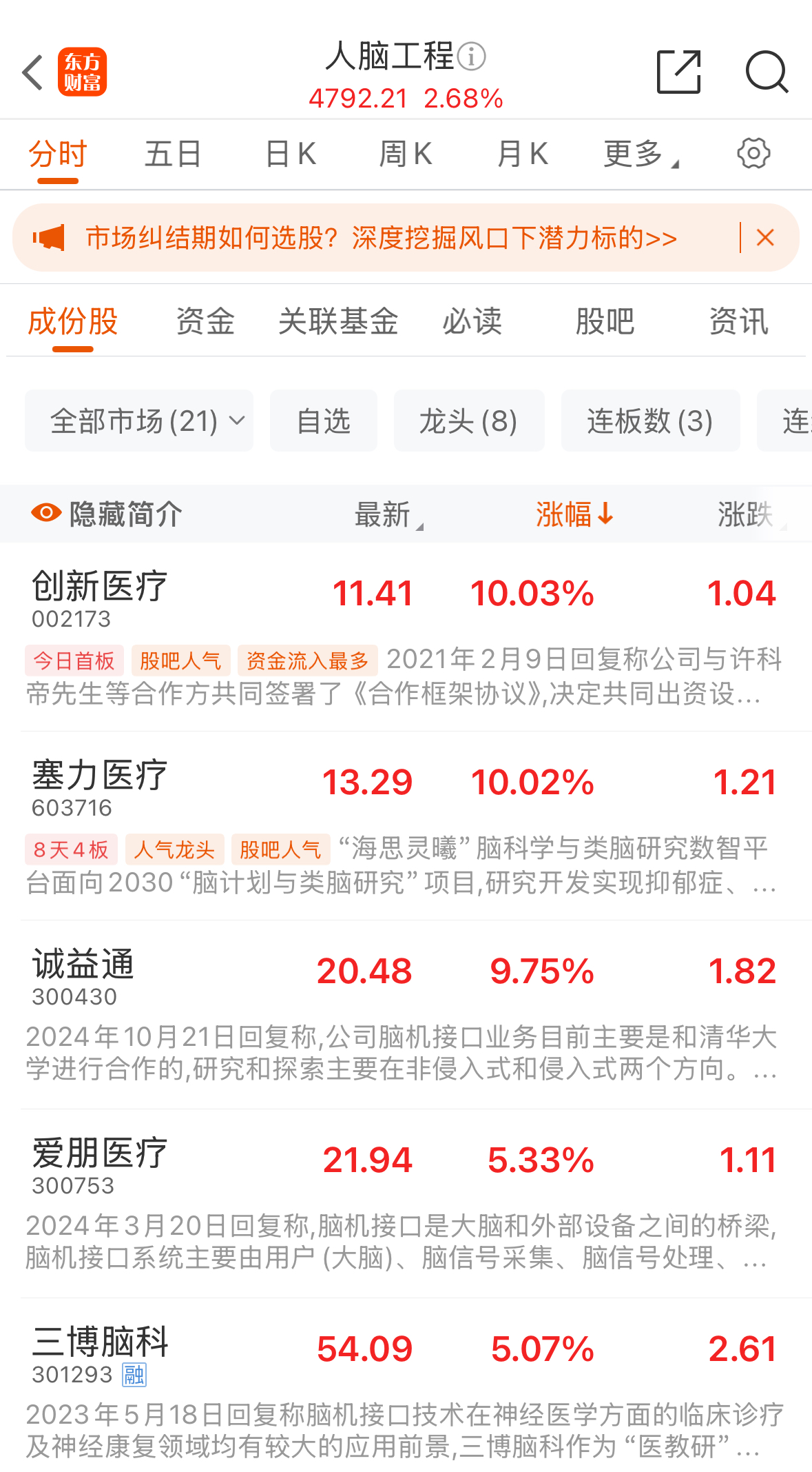 3月12日午后,人腦工程概念股異動(dòng)拉升,截至當(dāng)日收盤,人腦工程概念股整體指數(shù)漲幅達(dá)2.68%,成份股中,創(chuàng)新醫(yī)療管理股份有限公司(簡(jiǎn)稱“創(chuàng)新醫(yī)療”)、塞力斯醫(yī)療科技集團(tuán)股份有限公司(簡(jiǎn)稱“塞力醫(yī)療”)兩只個(gè)股漲停,北京誠(chéng)益通控制技術(shù)集團(tuán)股份有限公司(簡(jiǎn)稱“誠(chéng)益通”)大漲9.75%,三博腦科醫(yī)院管理集團(tuán)股份有限公司(簡(jiǎn)稱“三博腦科”)、江蘇愛朋醫(yī)療科技股份有限公司(簡(jiǎn)稱“愛朋醫(yī)療”)漲超5%。