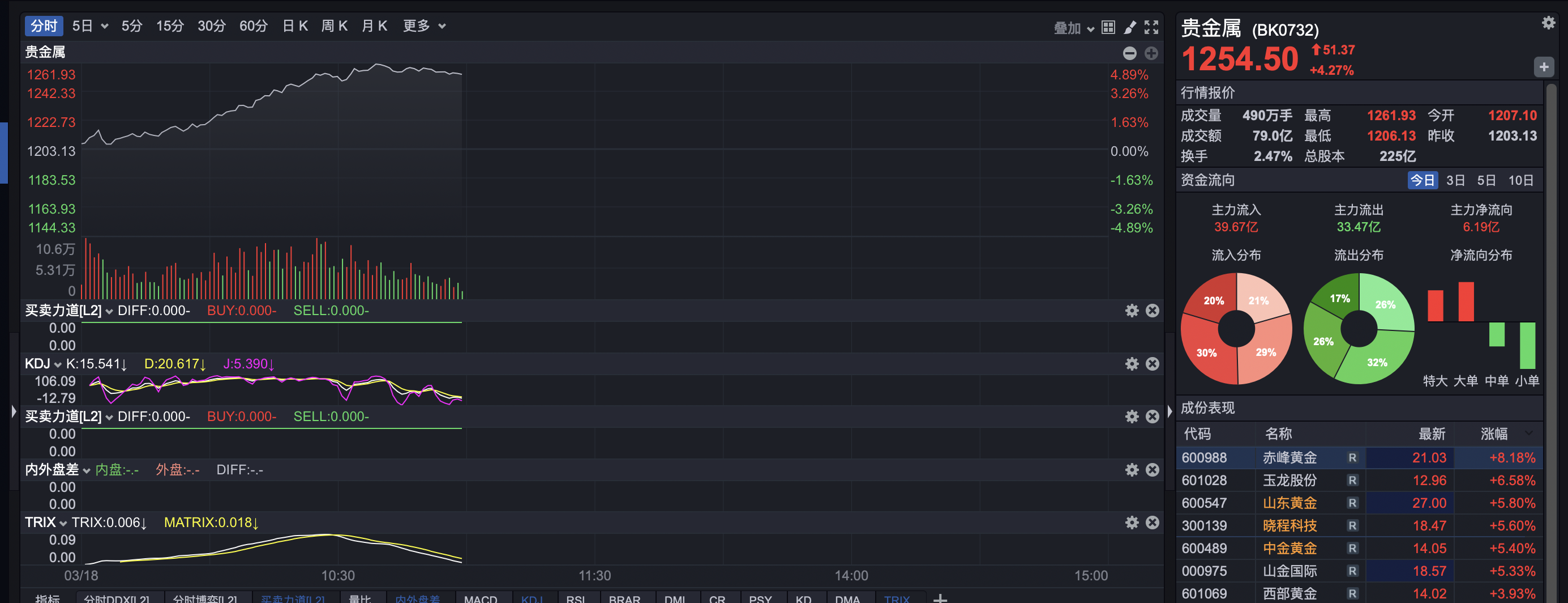 受金價上漲提振,A股市場貴金屬板塊盤中異動拉升,直線上揚(yáng)。截至記者發(fā)稿時,貴金屬行業(yè)板塊指數(shù)大漲4.27%,成份股中,除中潤資源投資股份有限公司(證券名稱:*ST中潤)外,其他個股悉數(shù)飄紅,赤峰吉隆黃金礦業(yè)股份有限公司(證券名稱:赤峰黃金)以8.18%的漲幅居前。
