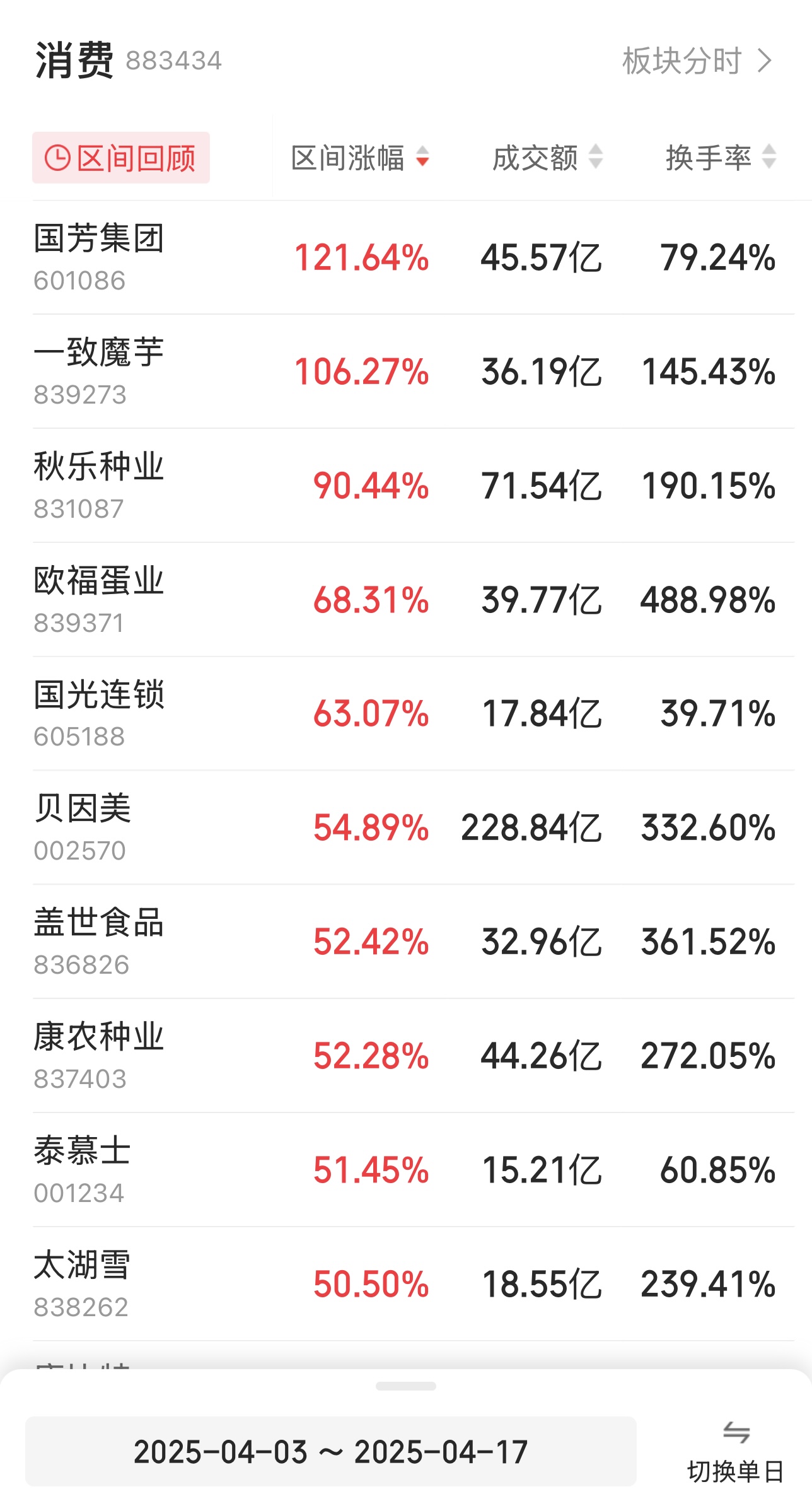 4月17日,A股主打“吃喝玩樂穿”,大消費(fèi)股盤中再度走強(qiáng)。截至收盤,安記食品股份有限公司(簡(jiǎn)稱“安記食品”,603696.SH)、天津桂發(fā)祥十八街麻花食品股份有限公司(簡(jiǎn)稱“桂發(fā)祥”,002820.SZ)、甘肅國(guó)芳工貿(mào)(集團(tuán))股份有限公司(簡(jiǎn)稱“國(guó)芳集團(tuán)”,601086.SH)、江西國(guó)光商業(yè)連鎖股份有限公司(簡(jiǎn)稱“國(guó)光連鎖”,605188.SH)等多只股票漲停。據(jù)同花順數(shù)據(jù),今日消費(fèi)板塊超20只個(gè)股漲停。