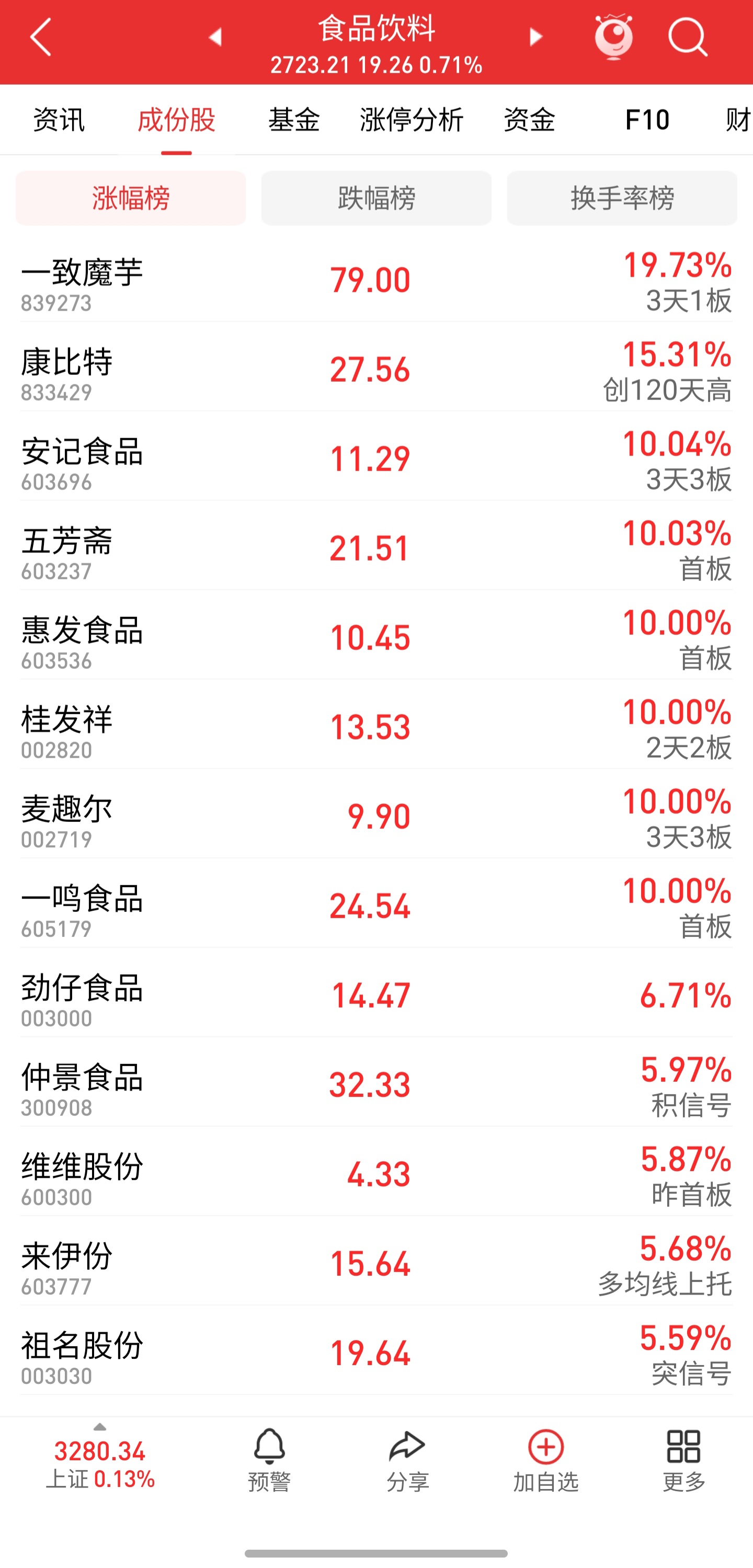 據(jù)通達信數(shù)據(jù),截至4月17日收盤,食品飲料板塊整體飄紅,安記食品(股票代碼:603696)、五芳齋(股票代碼:603237)、惠發(fā)食品(股票代碼:603536)等多只個股漲停,該板塊中,一致魔芋(股票代碼:839273)漲幅格外奪目,其股價收盤漲19.73%,報79元/股。
