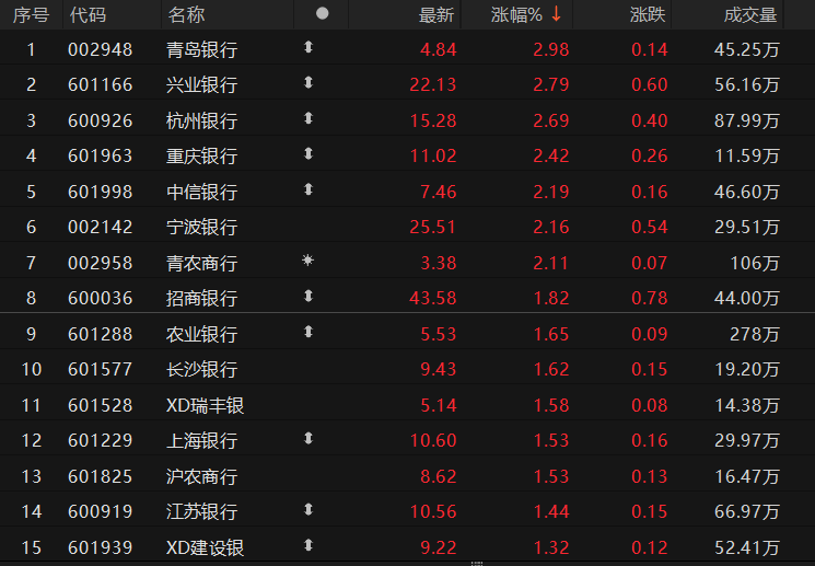 此外,銀行板塊逆勢走高,中國建設(shè)銀行股份有限公司(簡稱“建設(shè)銀行”)股價(jià)再創(chuàng)歷史新高,青島銀行股份有限公司(簡稱“青島銀行”)、重慶銀行股份有限公司(簡稱“重慶銀行”)、興業(yè)銀行股份有限公司(以下簡稱“興業(yè)銀行”)等多股漲逾2%。