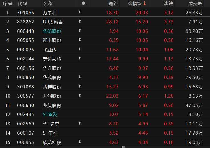 紡織服飾板塊5月9日開盤后表現(xiàn)活躍,個(gè)股方面,杭州萬事利絲綢文化股份有限公司(簡稱“萬事利”)實(shí)現(xiàn)20cm漲停,華紡股份有限公司(以下簡稱“華紡股份”)走出四連板,浙江迎豐科技股份有限公司(簡稱“迎豐股份”)、飛亞達(dá)精密科技股份有限公司(簡稱“飛亞達(dá)”)、安徽華茂紡織股份有限公司(簡稱“華茂股份”)等多股漲停。