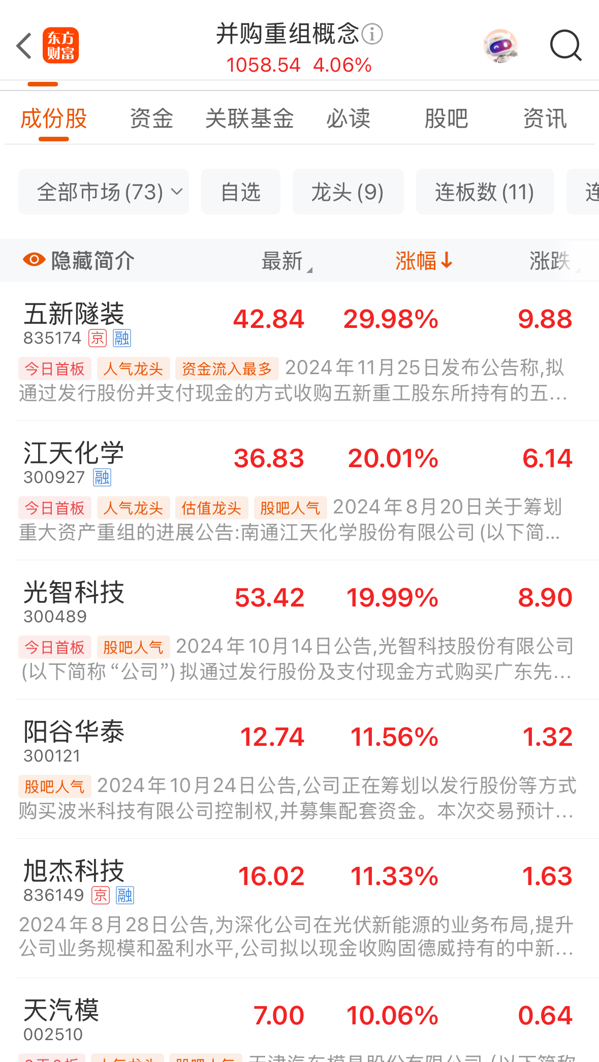 具體來看,并購重組概念板塊成分股中,北交所上市公司五新隧裝(835174)以“30CM”幅度收漲停;江天化學(xué)(300927)、光智科技(300489)“20CM”漲停;天汽模(002510)、本鋼板材(000761)、四川雙馬(000935)等個股“10CM”漲停;此外新巨豐(301296)、陽谷華泰(300121)個股紛紛跟漲。