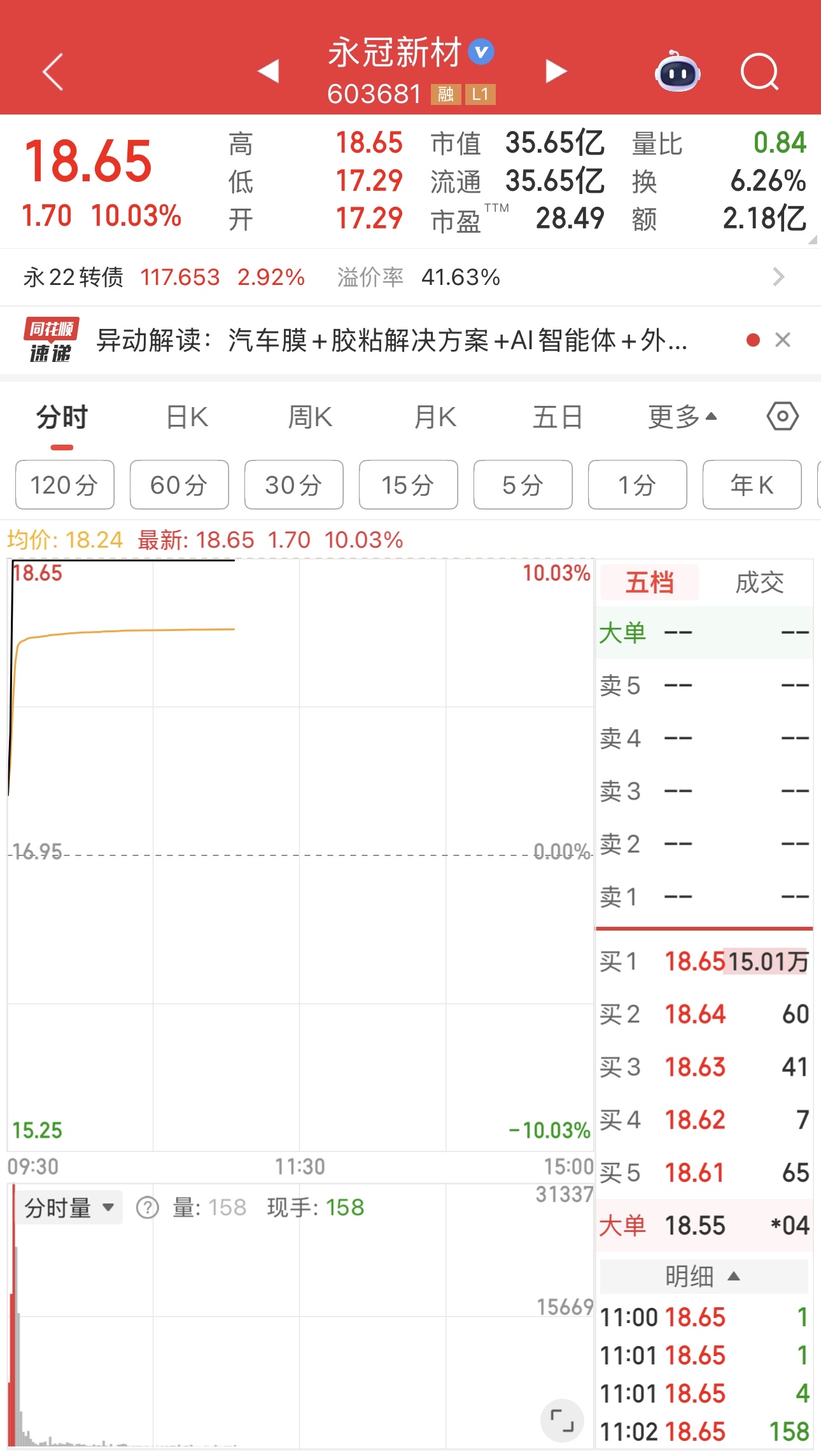 此外,永冠新材(603681)迎來(lái)“7天5板”。截至6月3日上午收盤,永冠新材報(bào)18.65元/股,漲幅10.03%,總市值35.65億元,流通市值35.65億元。