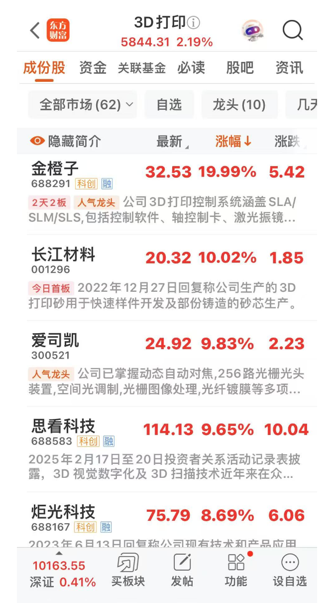6月16日下午開盤后,3D打印概念板塊漲幅明顯擴(kuò)大。東方財富軟件顯示,截至收盤,3D打印概念股中金橙子(688291)“20cm”漲停,長江材料(001296)“10cm”漲停,愛司凱(300521)、思看科技(688583)、炬光科技(688167)、金運(yùn)激光(300220)等股漲超8%。