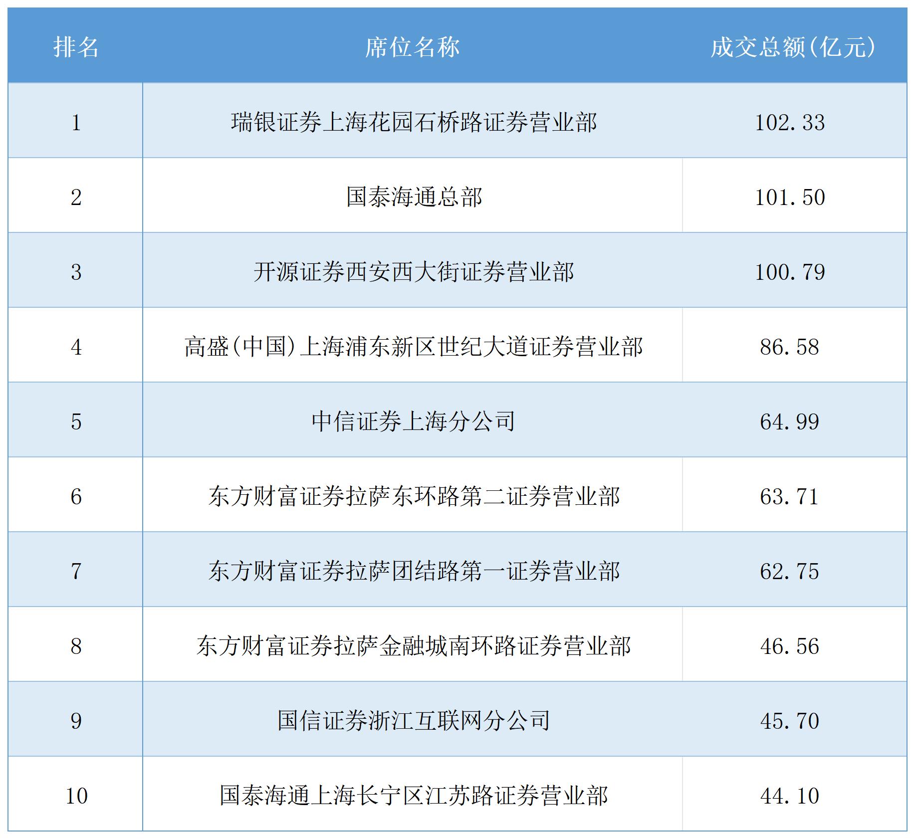 此外,躋身券商龍虎榜前十名的營(yíng)業(yè)部還包括中信證券上海分公司、東方財(cái)富證券拉薩東環(huán)路第二證券營(yíng)業(yè)部、東方財(cái)富證券拉薩團(tuán)結(jié)路第一證券營(yíng)業(yè)部、東方財(cái)富證券拉薩金融城南環(huán)路證券營(yíng)業(yè)部、國(guó)信證券浙江互聯(lián)網(wǎng)分公司、國(guó)泰海通上海長(zhǎng)寧區(qū)江蘇路證券營(yíng)業(yè)部,依次為第五名至第十名。
