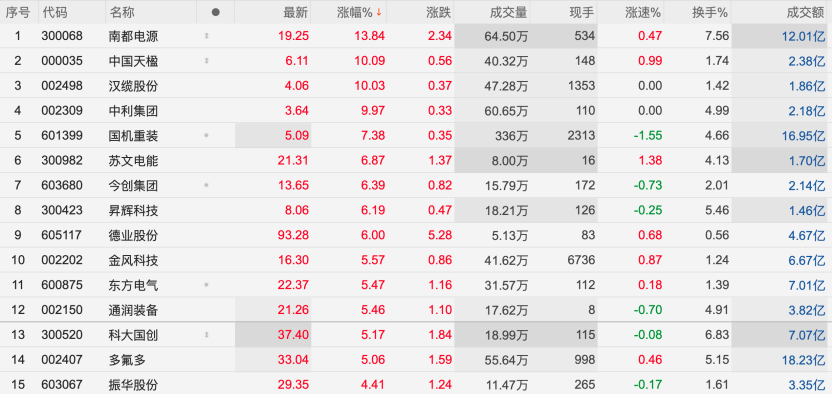 截至記者發(fā)稿,中國(guó)天楹(000035.SZ)、漢纜股份(002498.SZ)、中利集團(tuán)(002309.SZ)等多只儲(chǔ)能概念股強(qiáng)勢(shì)漲停,南都電源(300068.SZ)漲幅高達(dá)13.84%。此外,國(guó)機(jī)重裝(601399.SH)、蘇文電能(300982.SZ)、今創(chuàng)集團(tuán)(603680.SH)等個(gè)股也有不俗表現(xiàn),漲幅均超過6%。