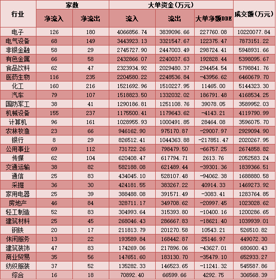 二、周三(12月30日)申萬(wàn)一級(jí)行業(yè)大單資金流向