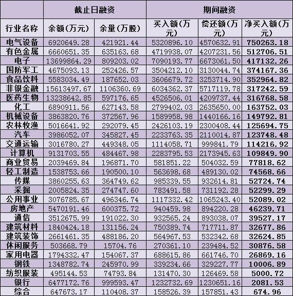從行業(yè)分布來看,今年以來截至1月8日,在28個申萬一級行業(yè)中,全部行業(yè)獲融資凈買入。其中,電氣設(shè)備行業(yè)最受融資客青睞,融資凈買入額達75.03億元;緊隨其后的是有色金屬、電子等行業(yè),融資凈買入額均超40億元,分別為51.27億元和41.71億元。由此計算,上述三行業(yè)融資客合計凈買入額達168.01億元。