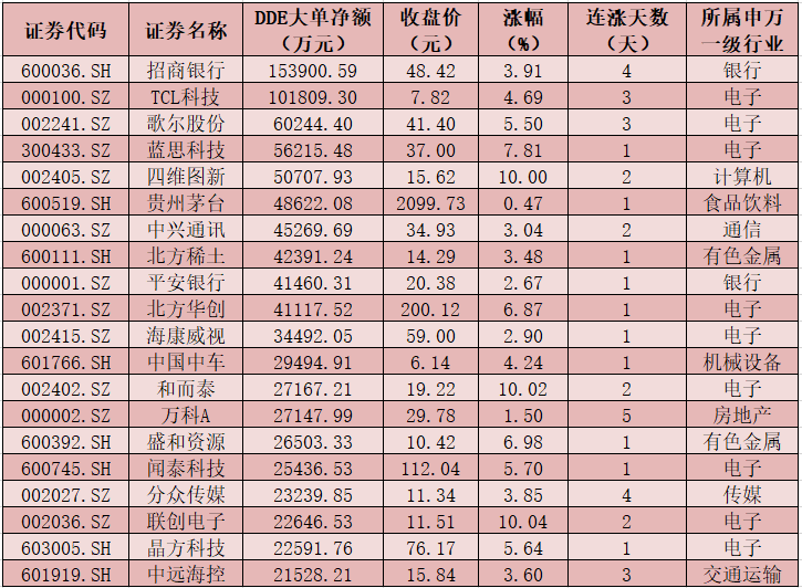 一、周一(1月11日)DDE大單資金凈買入TOP20