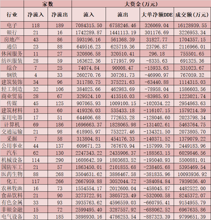 從資金層面看,今日A股大單資金整體凈流出513.82億元,其中,有1074只個股呈現(xiàn)資金凈流入,3010只個股呈現(xiàn)資金凈流出。從申萬一級的28個行業(yè)來看,有5個行業(yè)呈現(xiàn)大單資金凈流入態(tài)勢,其中,電子和銀行等兩行業(yè)資金凈流入均超30億元,分別為32.61億元和30.12億元,合計達62.73億元,緊隨其后的是房地產(chǎn)、通信、休閑服務(wù)等三行業(yè)。另外,電氣設(shè)備、非銀金融、有色金屬、食品飲料等行業(yè)資金凈流出均超50億元。