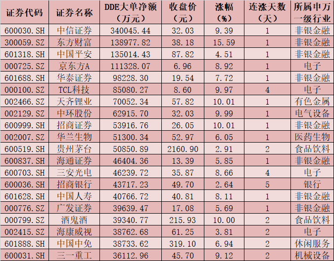 一、周二(1月12日)DDE大單資金凈買入TOP20