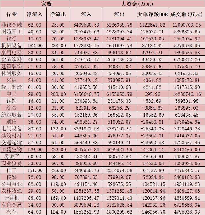 二、周二(1月12日)申萬一級行業(yè)大單資金流向