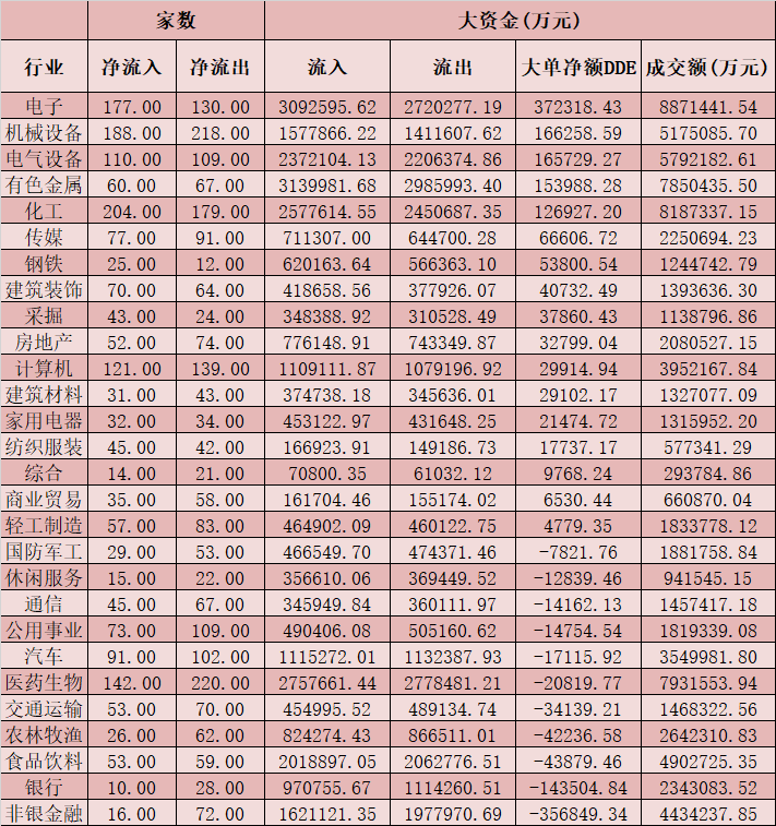二、周一(3月1日)申萬一級行業(yè)大單資金流向