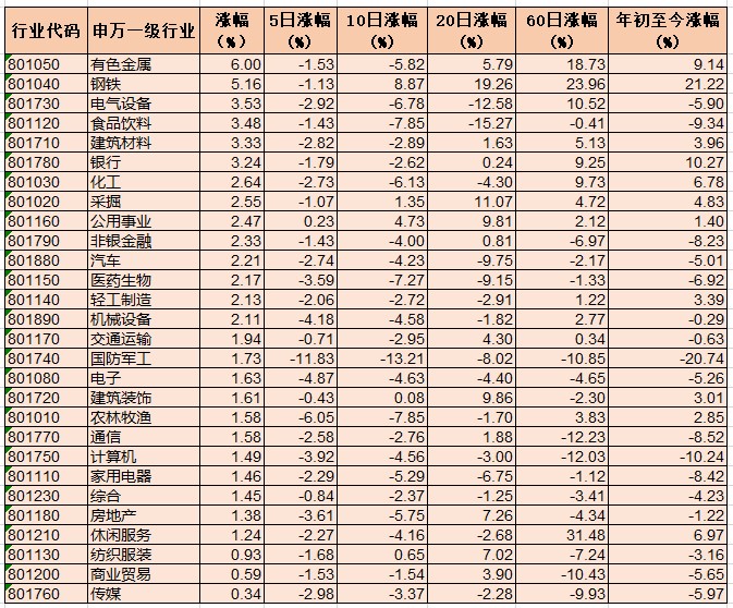 從行業(yè)指數(shù)表現(xiàn)來(lái)看,今日申萬(wàn)一級(jí)28個(gè)行業(yè)指數(shù)全部實(shí)現(xiàn)上漲,有色金屬行業(yè)指數(shù)領(lǐng)漲,漲6%,鋼鐵行業(yè)指數(shù)緊隨其后,漲5.16%,電氣設(shè)備、食品飲料、建筑材料、銀行等4個(gè)行業(yè)指數(shù)漲幅均超3%。